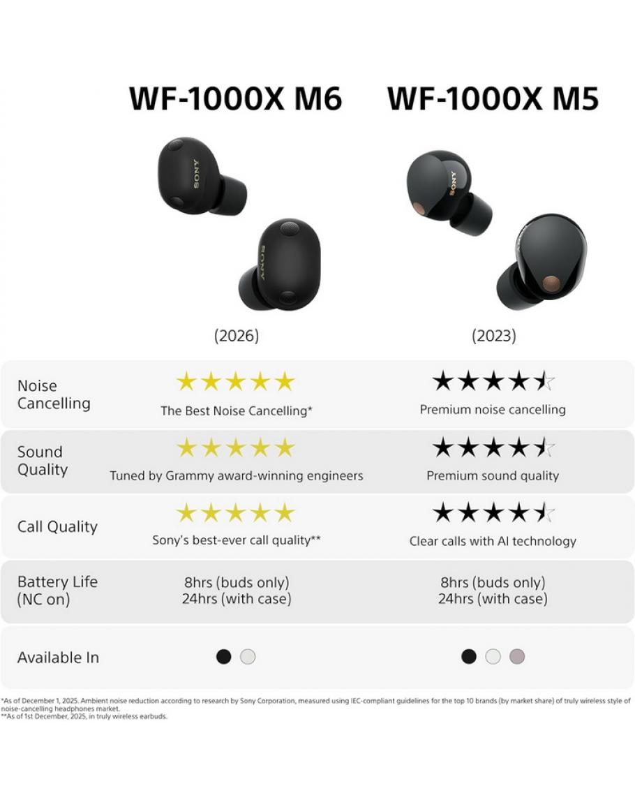 WF-1000XM6 v primerjavi s predhodnim modelom zagotavljajo kar 25 % učinkovitejše odpravljanje šumov. To omogočajo novi HD-procesor za odpravljanje šumov QN3e, integrirani procesor V2, optimizirano prilagodljivo odpravljanje šumov ter štirje mikrofoni v vsaki slušalki. Posebej izboljšano je dušenje šumov v srednjem in visokem frekvenčnem območju, kar zagotavlja več tišine tudi v zahtevnih okoljih, kot so javni prevoz ali kavarne. Zvok je bil razvit v sodelovanju s priznanimi zvočnimi inženirji iz svetovno znanih snemalnih studiev, zato slušalke omogočajo poslušanje glasbe tako, kot so si jo zamislili ustvarjalci. Podpora za Hi-Res Audio Wireless, DSEE Extreme in 360 Reality Audio ter 10-kanalni izenačevalnik v aplikaciji Sony | Sound Connect poskrbijo za prilagodljivo in izjemno zvočno izkušnjo.